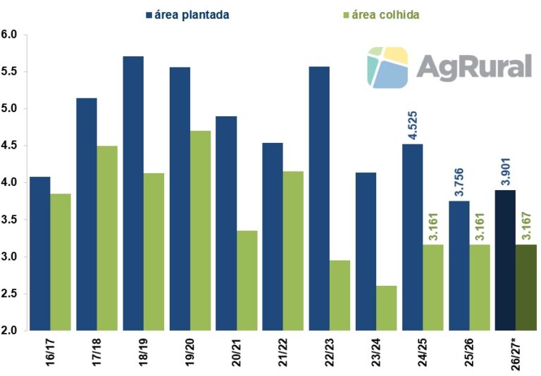 USDA/AGRURAL Em milhões de hectares. *USDA 31/mar plantada, com % abandono Outlook Forum para colhida.