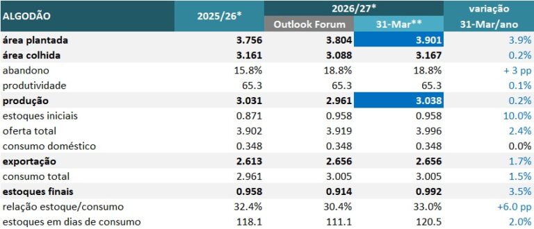 O relatório de intenção de plantio divulgado pelo USDA nesta terça-feira (31) veio na contramação das expectativas e apontou um pequeno aumento na área plantada com algodão na safra 2026/27 dos EUA, cuja semeadura está começando. A estimativa de área plantada veio em 3,901 milhões de hectares, contra 3,804 milhões na projeção preliminar de fevereiro (Outlook Forum) e 3,756 milhões de hectares na safra passada.