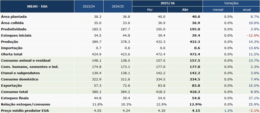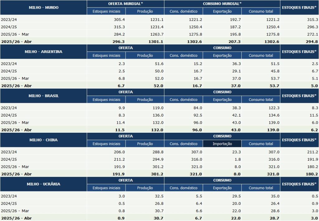 Confira as principais informações sobre oferta e demanda mundial de milho divulgadas pelo USDA em 9/abr: