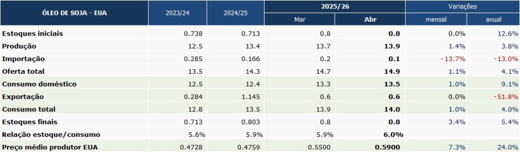 Em milhões de hectares, produtividade em sacas de 60 kg por hectare, preços em US$ por bushel (27,216 kg) e demais itens em milhões de toneladas métricas, exceto %.