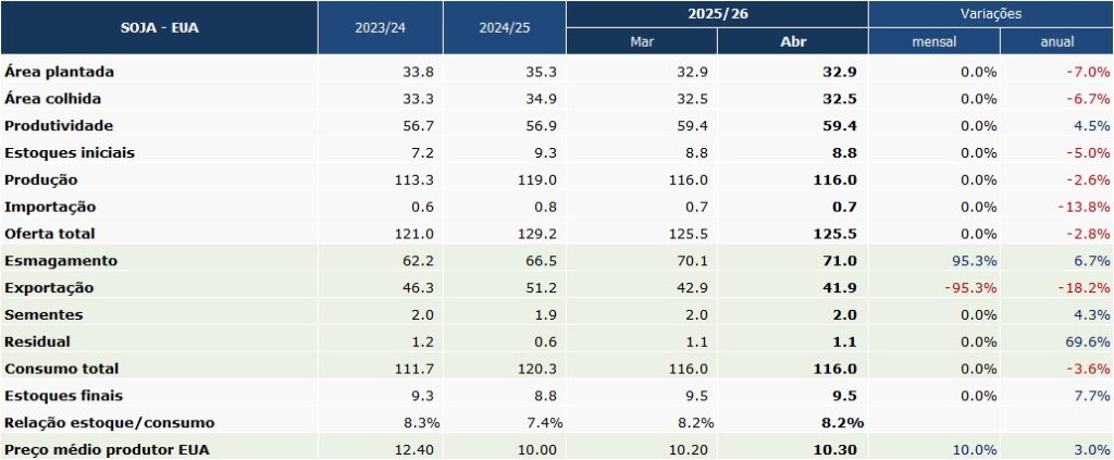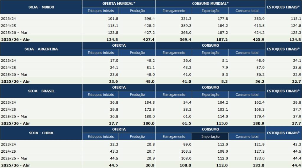 Confira as principais informações sobre oferta e demanda mundial de soja divulgadas pelo USDA em 9/abr: